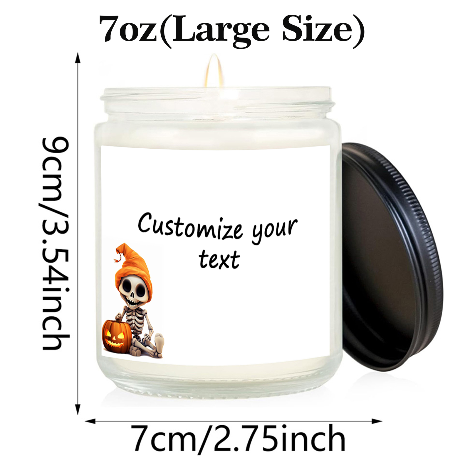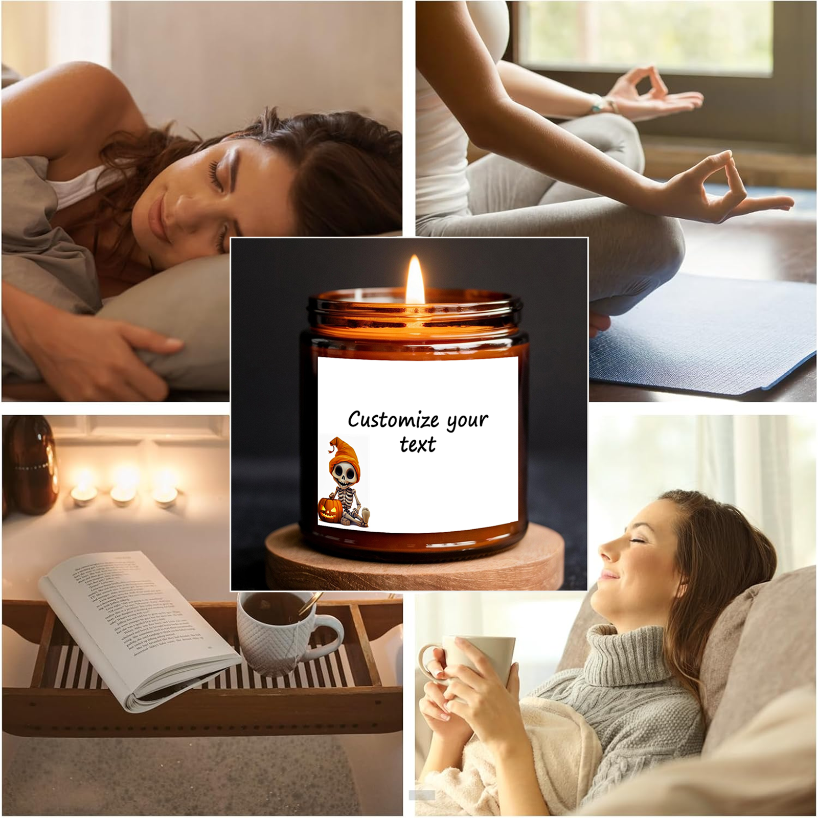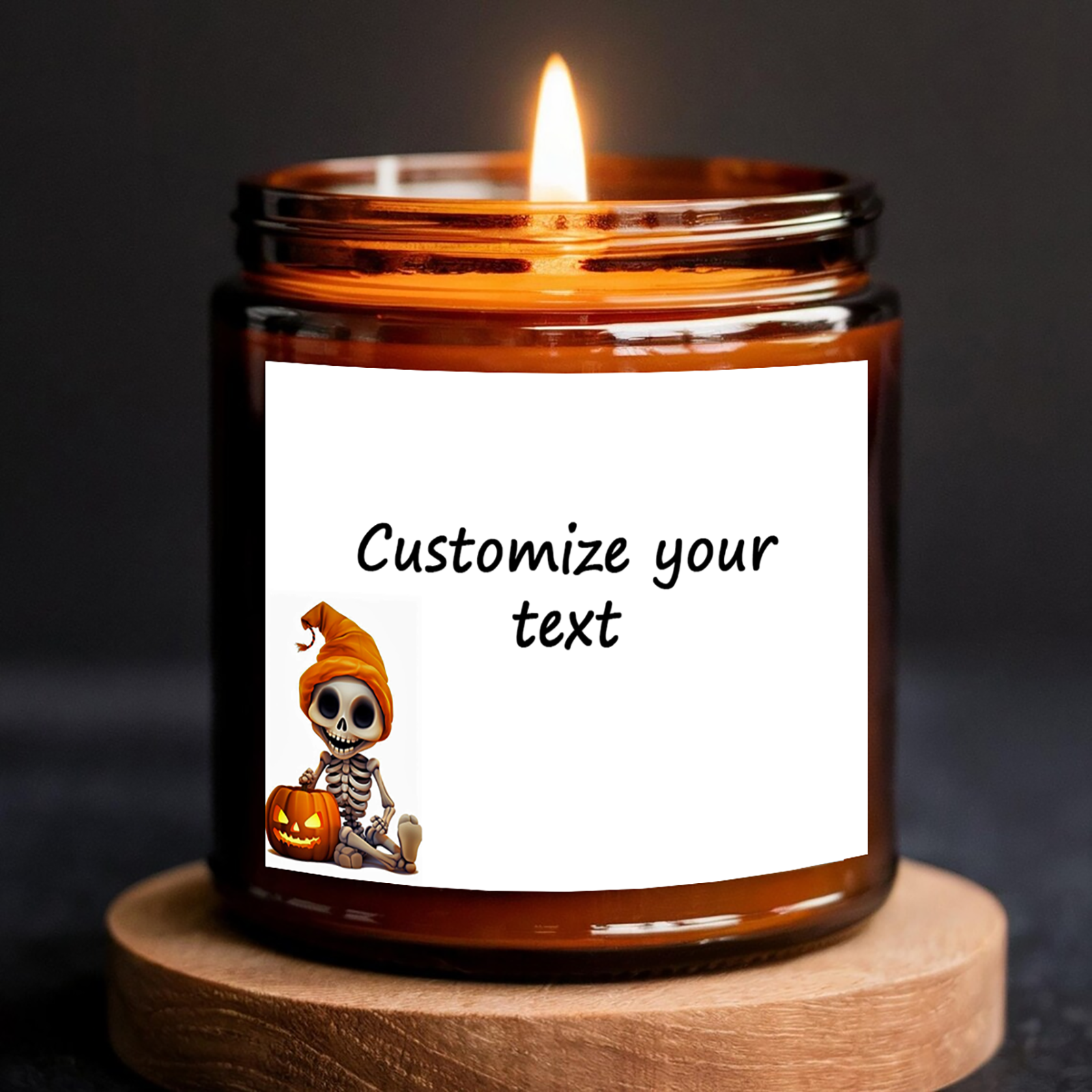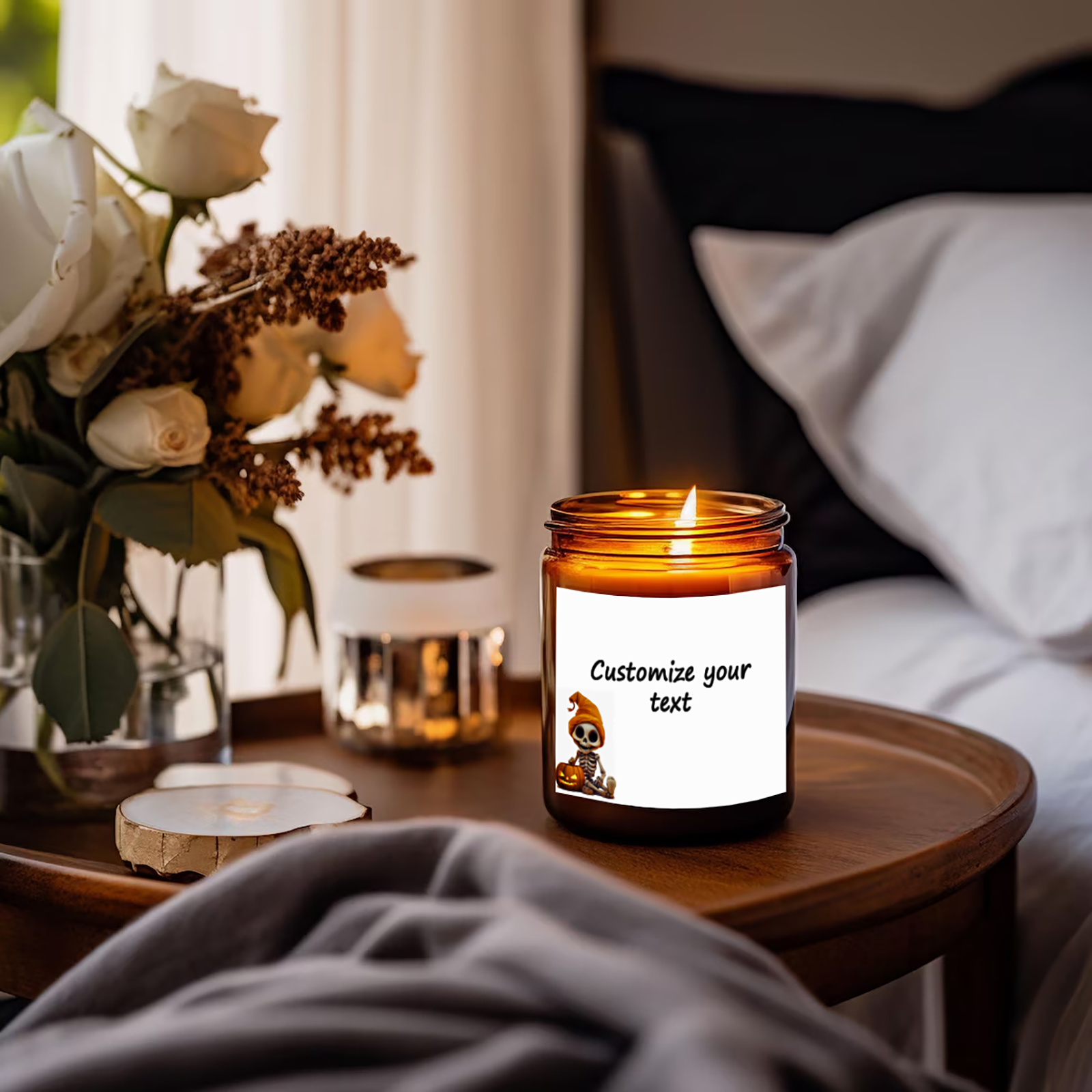 Personalized Halloween Scented Candle - Custom Text with Skeleton & Pumpkin Design - Smokeless Soy Wax in Amber Jar - Unique Halloween Gift for Him/Her