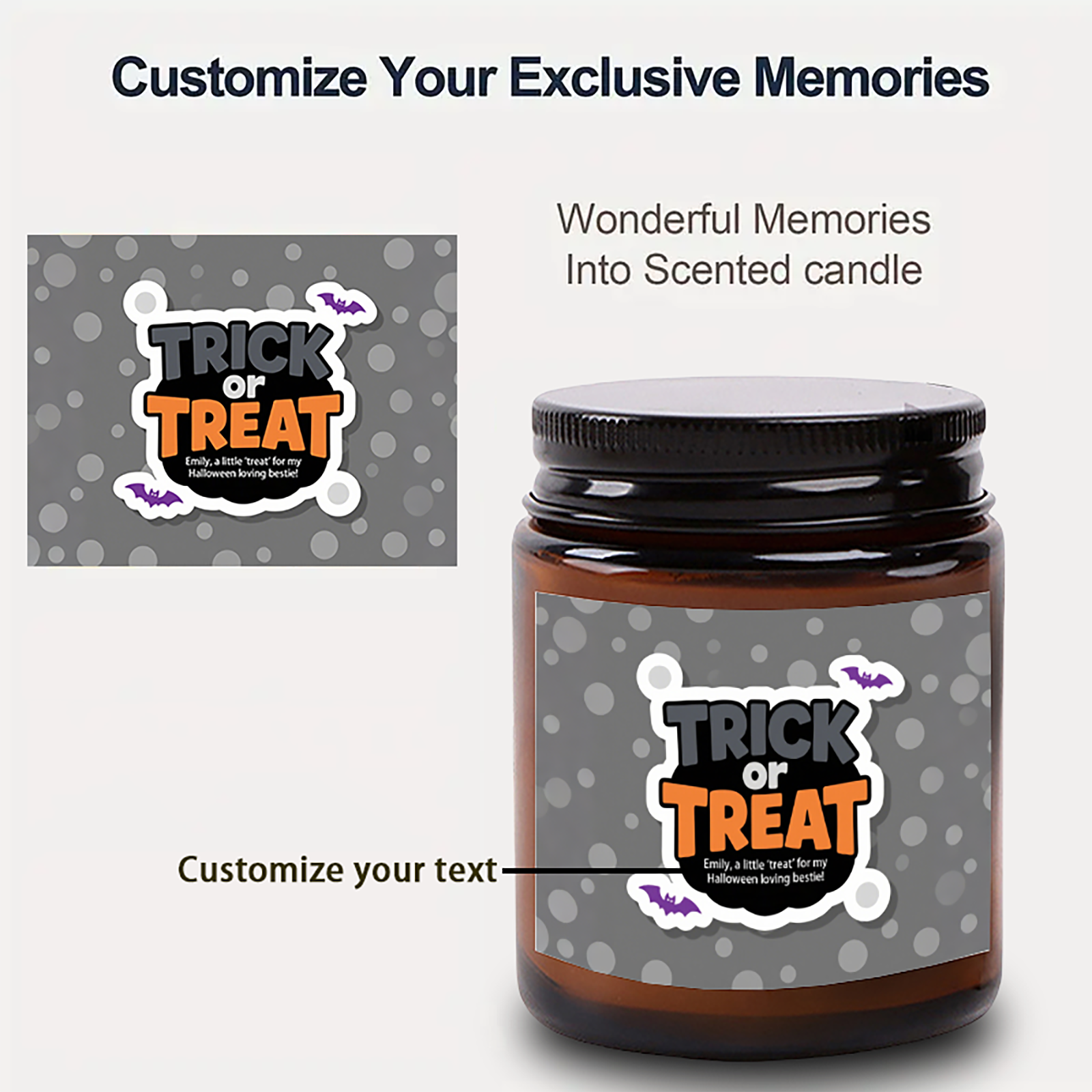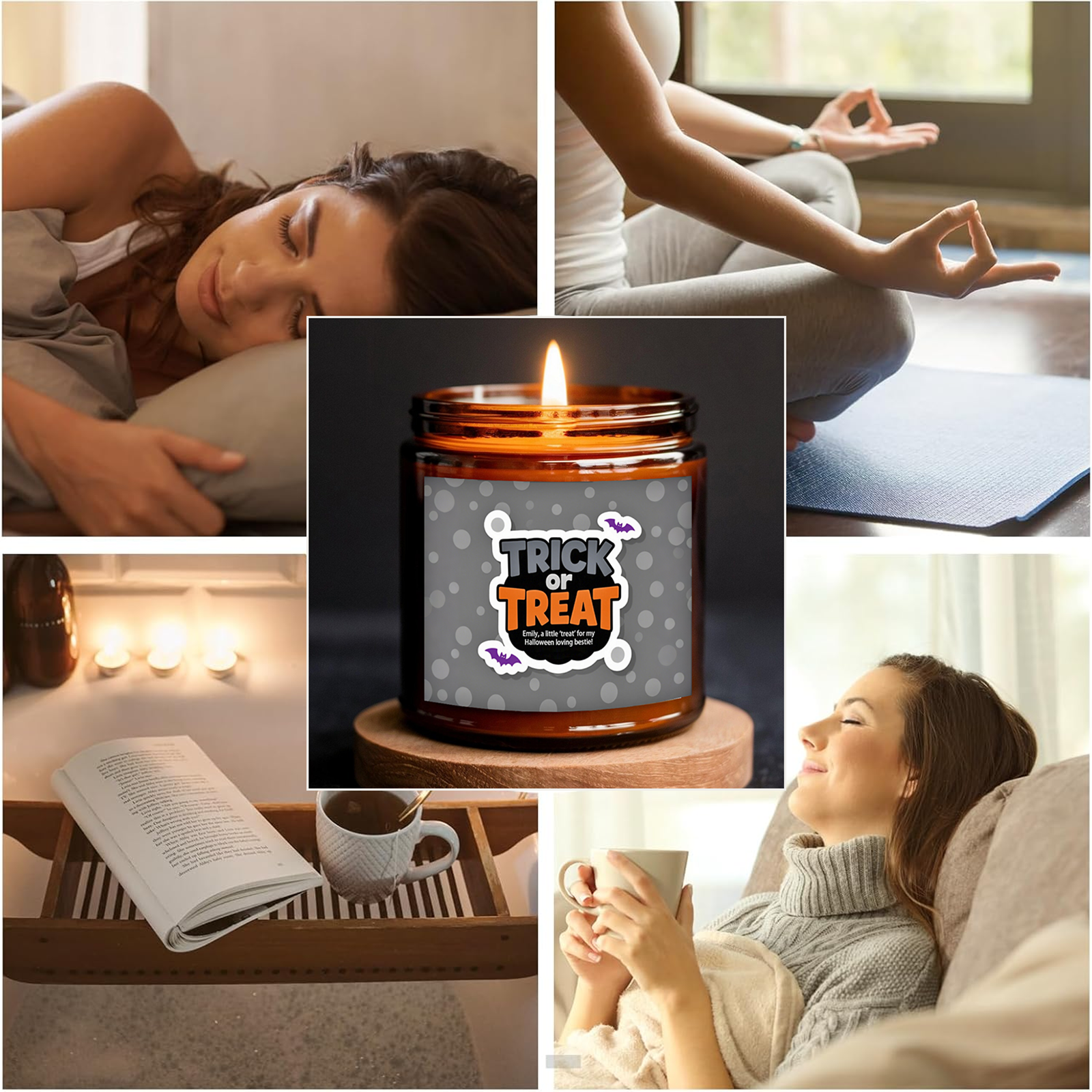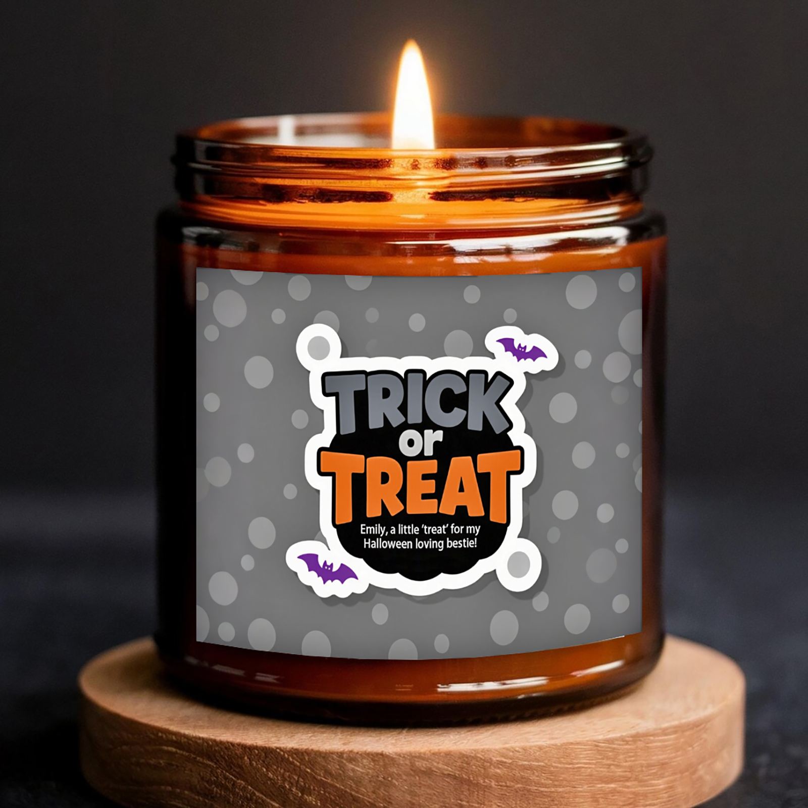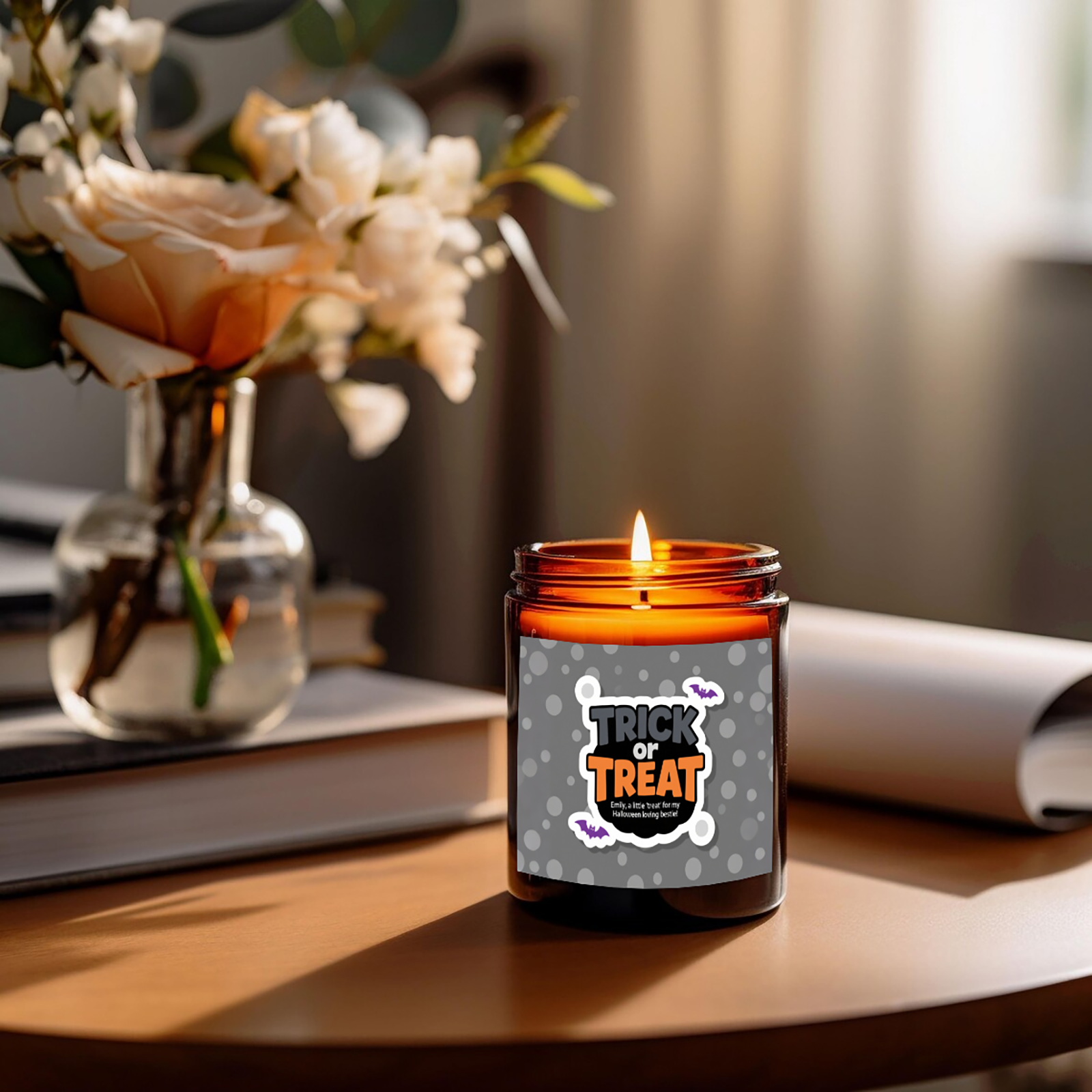 Personalized Halloween Scented Candle - "Trick or Treat" Design with Custom Message - Smokeless Natural Wax in Amber Jar - Unique Halloween Gift for Him/Her