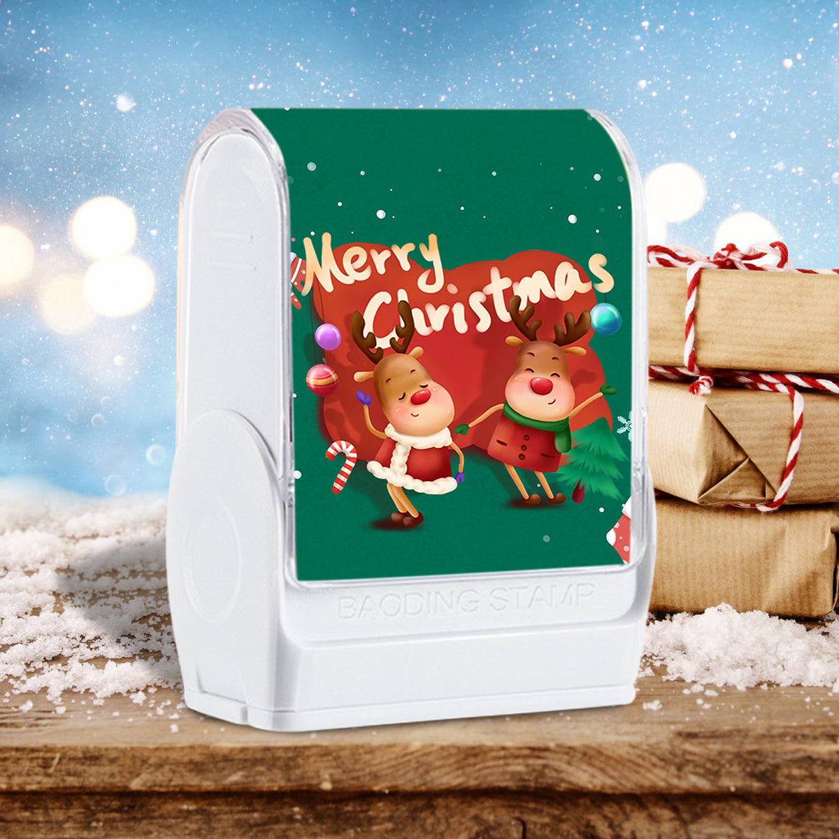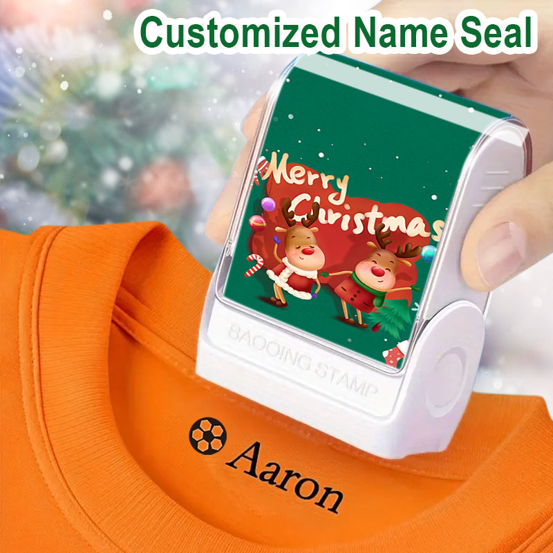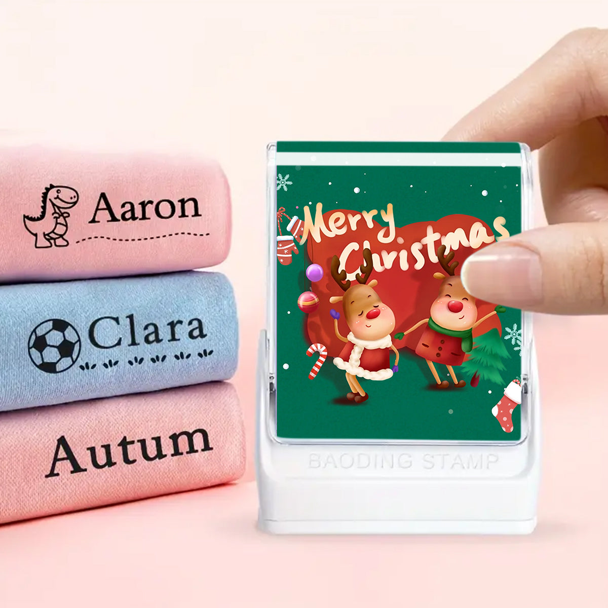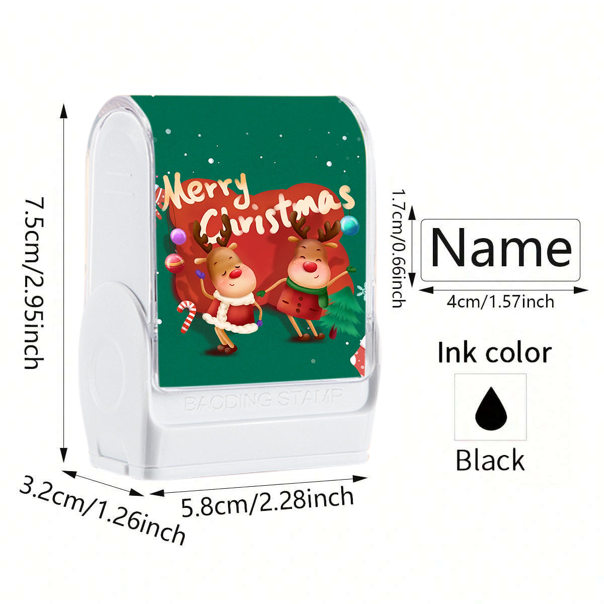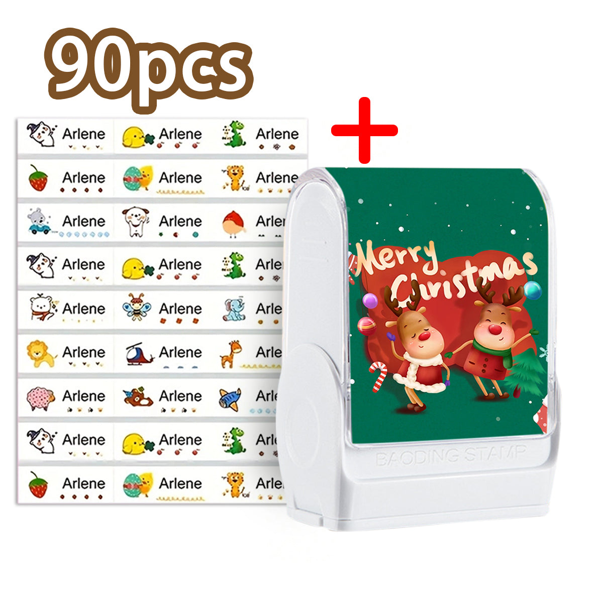 (90PCS Stickers + 1PC Stamp Set)Christmas Reindeer Custom Name Stamp Kit - Waterproof Personalized Self-Inking Stamp for Kids' Clothing, Stationery - DIY Gift & Item Identification Seal-yy